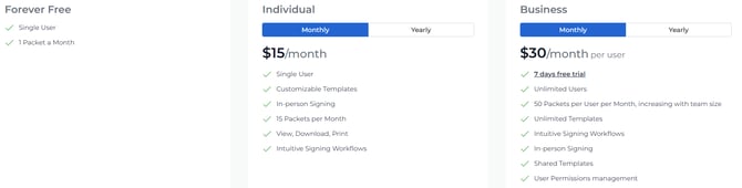 - Individual: Enhanced features for individual users, with 15 packets per month, in-person signing, customizable templates, and more.